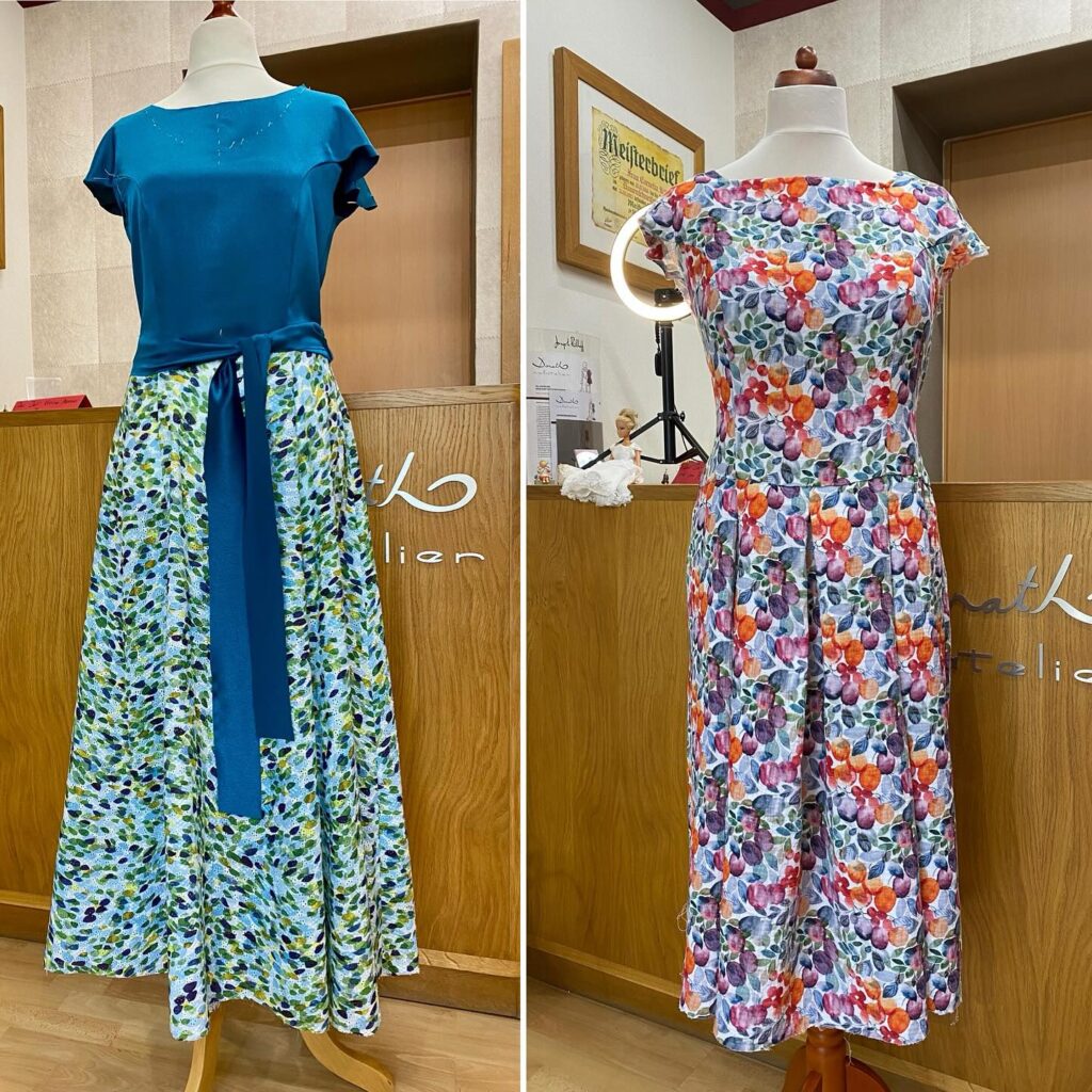 Hier zwei Exemplare zur Erste Anprobe für Brautmama & Sommerlady in Satin, Lochstickerei und buntem Baumwollcrepe.